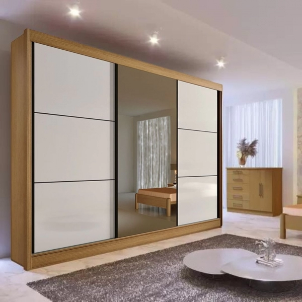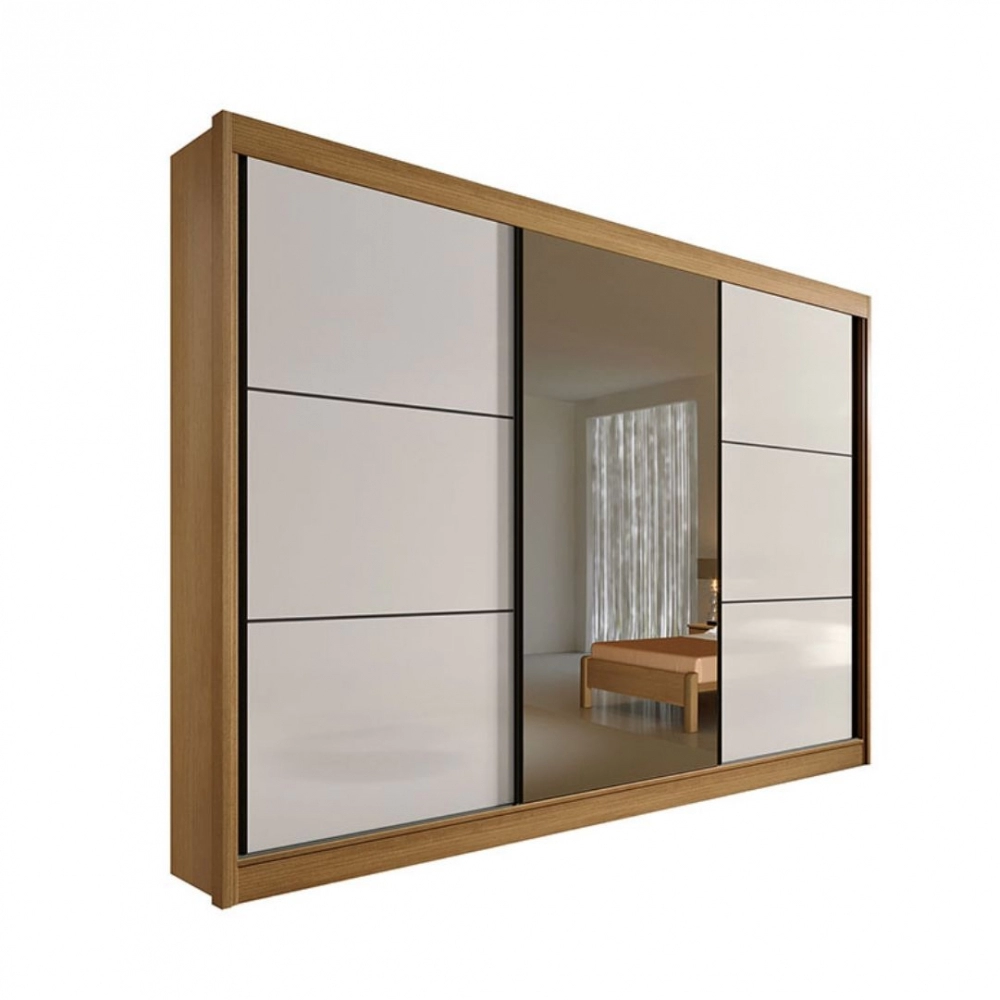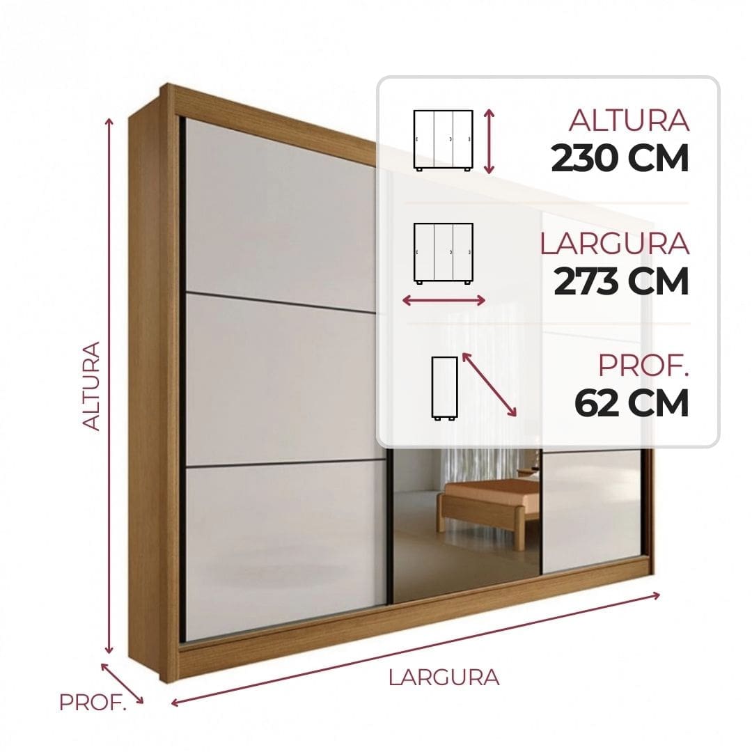 Com 3 portas deslizantes, o móvel otimiza o espaço e proporciona praticidade no uso diário. Seu sistema de roldanas com mola assegura deslizamento suave e silencioso, enquanto o espelho com película de segurança amplia o ambiente e adiciona funcionalidade.